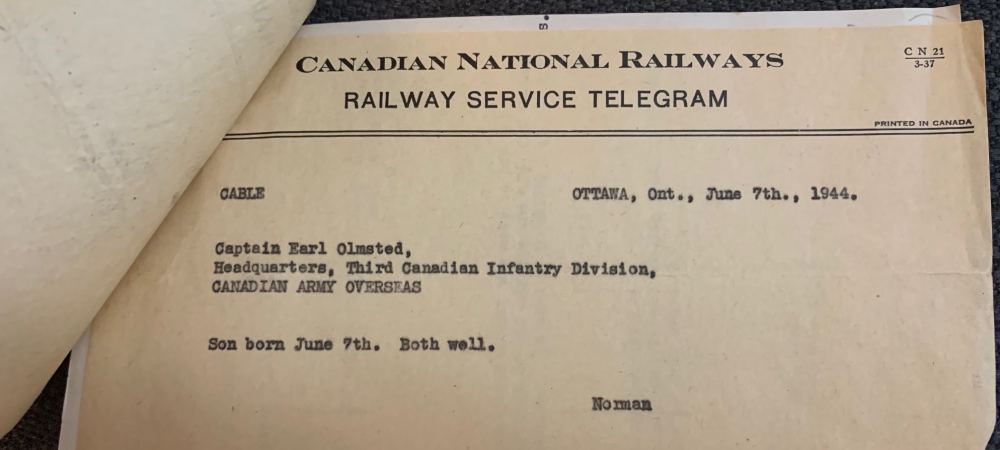 (Lt.-Col. Olmsted learned from this telegram that he became a father the day after D-Day)