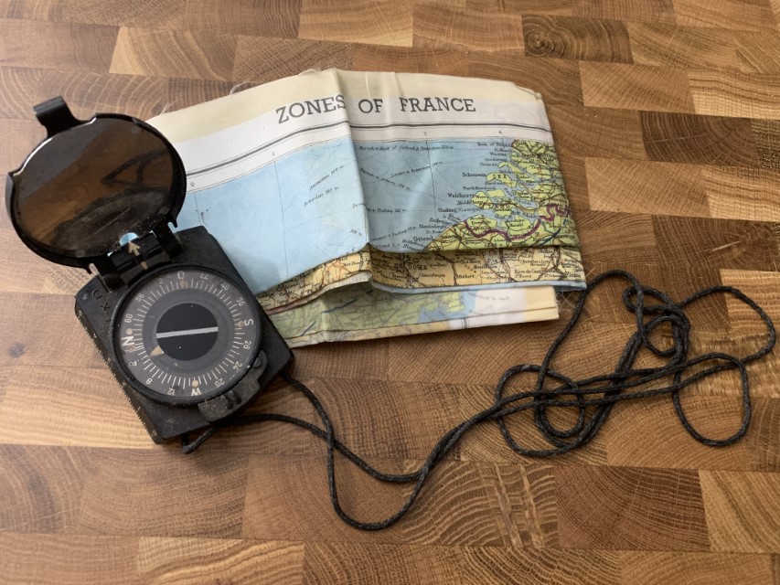(The actual compass and maps used by Lt.-Col. Earl Olmsted on D-Day, June 6, 1944)