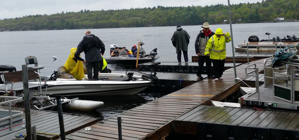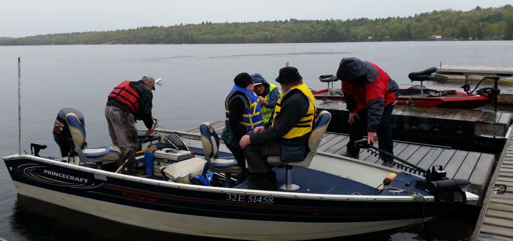 Although the weather was raining for the tournament event day on Saturday, all 26 Blind Anglers happily boarded the boats of the 16 Pro Anglers and headed out onto Kennebec Lake. By the deadline of 3:00pm, all had returned to Springwood Cottages. Results were tallied for Biggest Pike, Number of Pike with the maximum of 6 being broken through total weight, and Catch of the Day. Trophies were awarded with a delicious beef dinner enjoyed by the group.