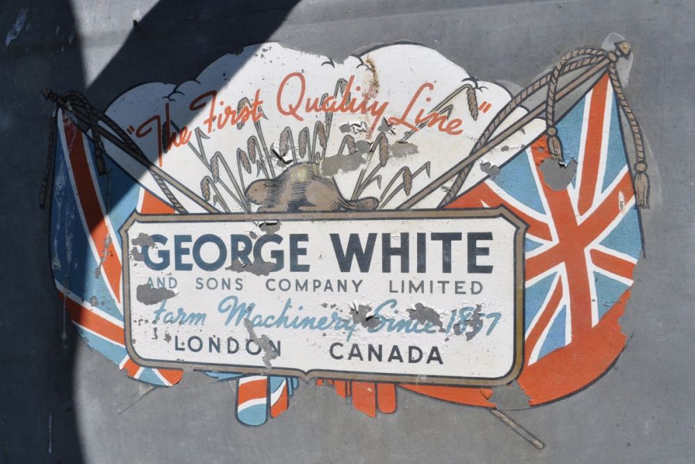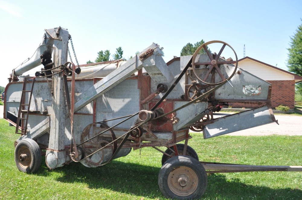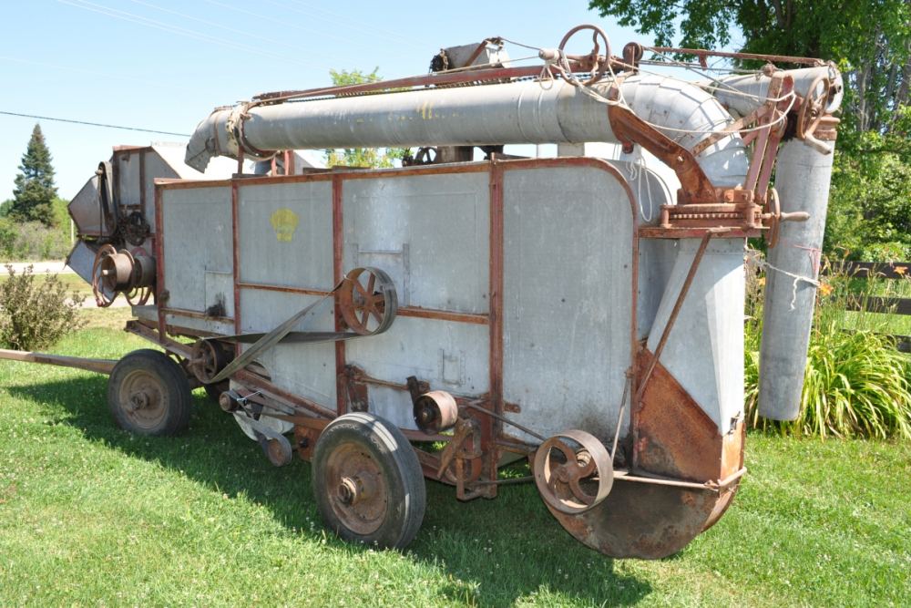 (Front side (photo left) and back side (photo right) of a 1948 George White No. 6 Threshing machine owned by Charles McGuire. Photo: Stittsville Central)
