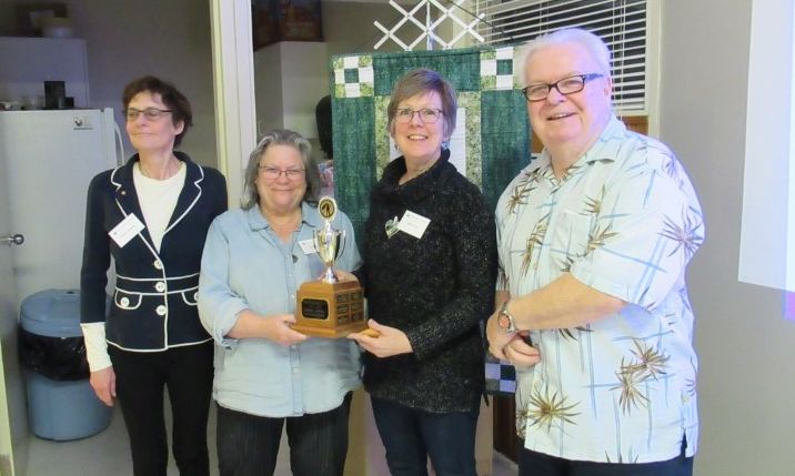 (Presentation of the Goulbourn Stittsville Horticultural Society photo contest trophy to Kathy Lunau. L to R: Penny Horeczy, Vice-President; Judith Cox, President; Kathy Lunau, Best in Show winner; John Brummell, Contest Judge. Photo: Stittsville Central)