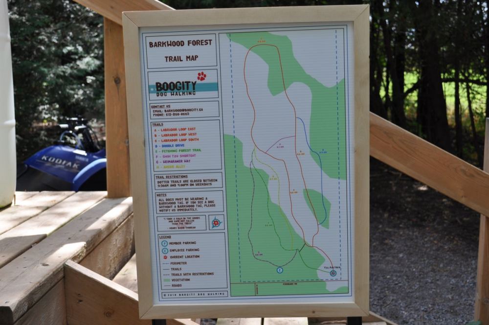 We met Kevin at the gate. With introductions over, maps read, we headed to the trails that cover the 100 acre property. Along the way, Kevin told us that “having been in Dunrobin for four years with their dog-walking business – after convincing a tree farmer to let the dogs roam between the trees – the farmer realized this could be a business opportunity for himself and started to bring in other dog walkers”. “With these new dogs lacking in social training, it was time to look elsewhere for a new Boogity home” added Kevin.