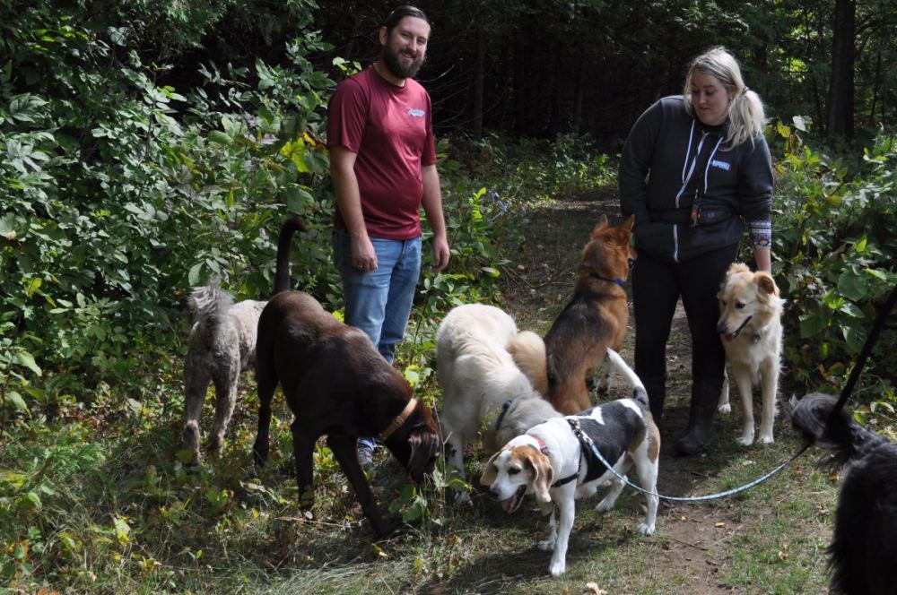 Kevin had worked in HR for IT for years, but recently “retired” to take over as the resident forestry expert of Barkwood. He has cut the brush for the trails and just this past week cut out another trail in the fenced training area. The couple rent the farm property and have put a lot of work into preparing the site to make it a safe and exploratory place for dogs with the entire 100 acres ensconced in fencing. There are trails bearing dog breed names, water stations, a rinsing station for those muddy days and the property has been sectioned into two – welcoming paths for unleashed walks being one and the other a smaller fenced-in area of paths used for training purposes.