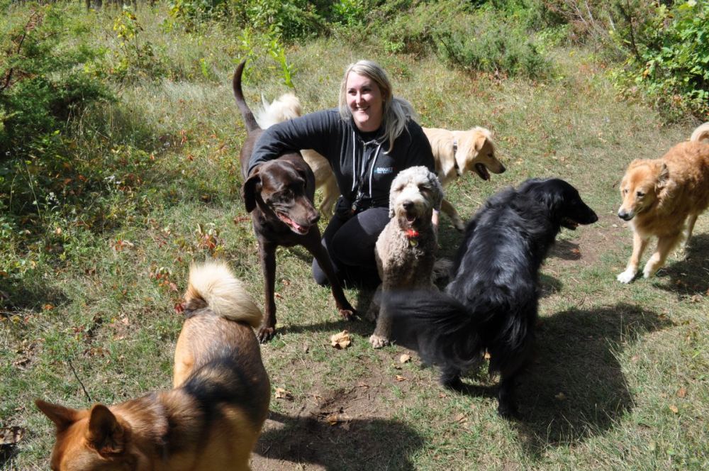 When a member of Boogity, and should you choose this service, your dog will receive personal round-trip transportation from your house to Barkwood and return. They now cater to Stittsville, Kanata, Carleton Place and Barrhaven. A member of the dedicated staff will lead the ‘pack walks’ of a small group of dogs along the trails for their off-leash adventure. You can be assured that your dog is in good hands when they head off to meet their friends at Barkwood — each staff member is certified and trained in CPR, are bonded and insured. While out for the tour, we ran into staff member Lisa with her pack walk group. Our dogs, being of good temperament, blended right in and were hard to discern among the group.
