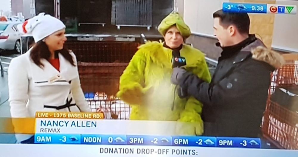 Stittsville real estate broker, Nancy Allen, is busy these days with a goal to fill 500 brown bags of non-perishable food by December 4th. Nancy, again this year, is participating in the CTV Morning Live Holiday Helpers Food Drive. You may recall that Nancy, posing as The Grinch, appeared on CTV last year for her drop-off. This year she is taking on a new personality that just may be a childhood character from Frozen. You will have to watch CTV Morning to see the unveiling on Thursday, December 5th.