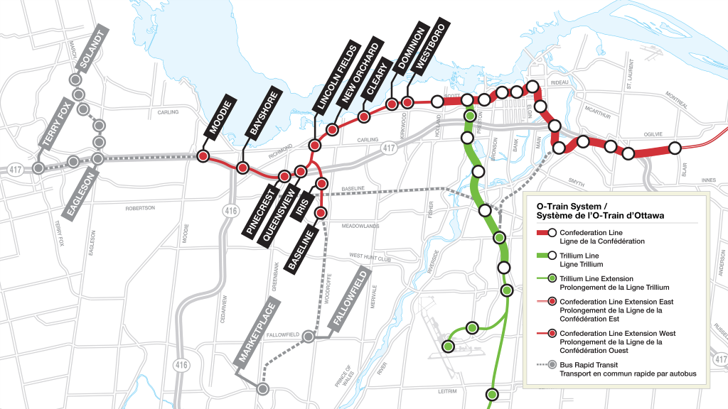 (Map of the O-Train system showing the Confederation Line – bolder red line – to start running on September 14. Photo: OC Transpo)