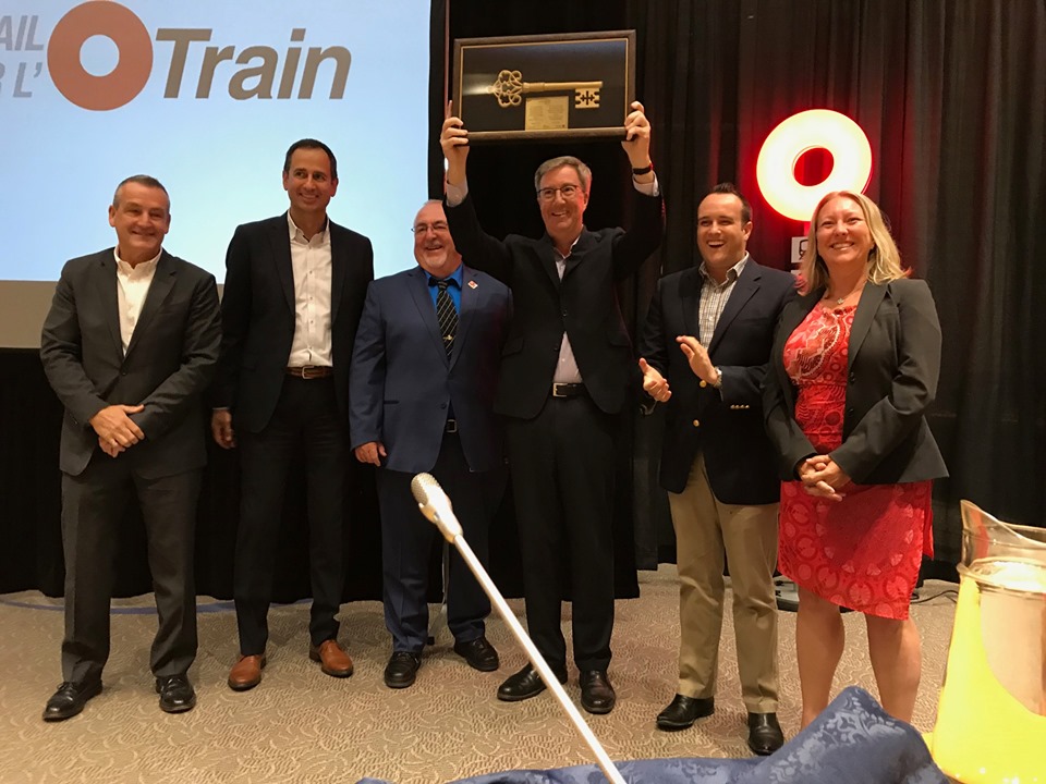 (City of Ottawa Mayor Jim Watson accepts keys from RTG for the O-Train Confederation Line at ceremony on August 23, 2019. Photo: Mayor Jim Watson)