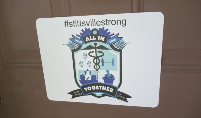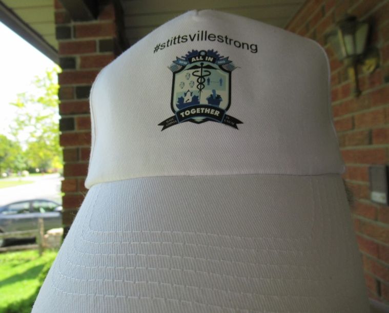 The unique and locally designed ‘COVID Coat of Arms with the #stittsvillestrong message is emblazoned on each item. Support a good cause with the purchase of your exclusive Coat of Arms t-shirts, hats or other items!