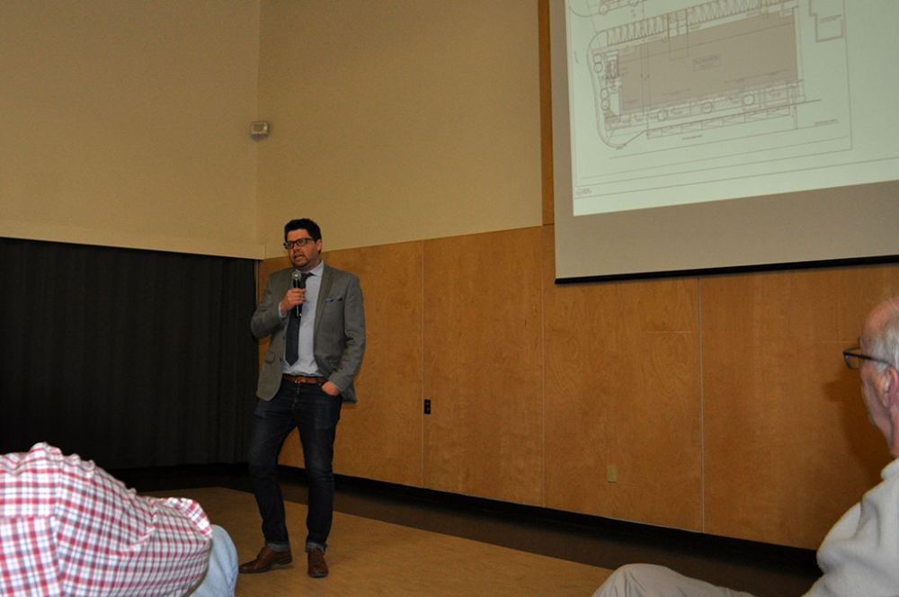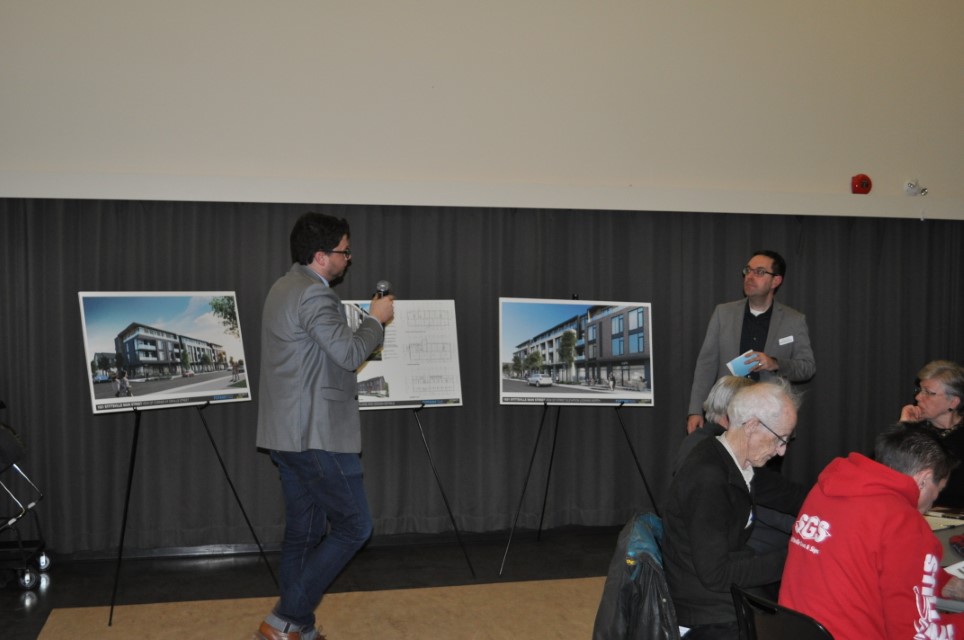 The architect, Ryan Koolwine, spoke about the consideration given to the cedar wood, stone and brick treatments to be used on the façade of the building in an attempt to reflect the heritage of the area. It will also be made to appear as 3 separate segments from the street view to compensate for the large scale of the building. The building will be set back from Main Street beyond what is required by the City’s zoning requirements in order to give more space for people to interact with the stores at the street level.