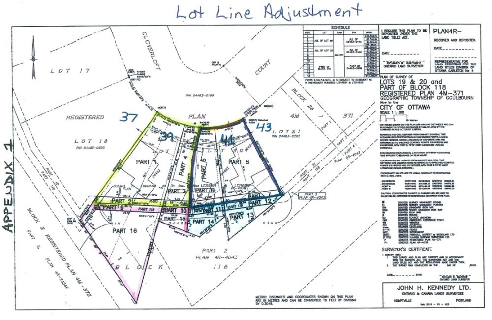 PBC Sweetnam Holdings Inc., owners of 39 (39A) & 41 Cloverloft Court, 2 Cripple Creek Crescent are requesting a conveyance for portions of its property to the abutting landowners to the north at 39 and 41 Cloverloft Court. The Owner of 39 Cloverloft Court is then proposing to divide the two enlarged parcels into three new lots, each new lot is proposed to contain a detached dwelling with a secondary dwelling unit. Proposed lot line adjustments to facilitate the creation of these parcels have also been filed as applications because these newly created parcels will not be in conformity with the requirements of the Zoning By-law and therefore, Minor Variance Applications (D08-02-18/A-00404 to D08-02-18/A-00406) have been filed and will be heard concurrently with these applications.