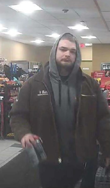 This person of interest is described as a Caucasian male, in his twenties, heavyset, with a brown beard. He was wearing a brown jacket with a grey-hooded sweat-shirt (see photo below).