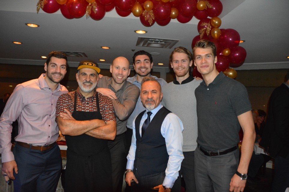 (Attending Napoli’s annual customer appreciation and charity dinner in December 2019 are Ottawa Senators players with Milad and Bassel Khalil. L to r: Dylan DeMelo, Milad, Craig Anderson, Nick Paul, Bassel in front, Marcus Hogberg, and Andreas Englund. Photo: Napoli’s)