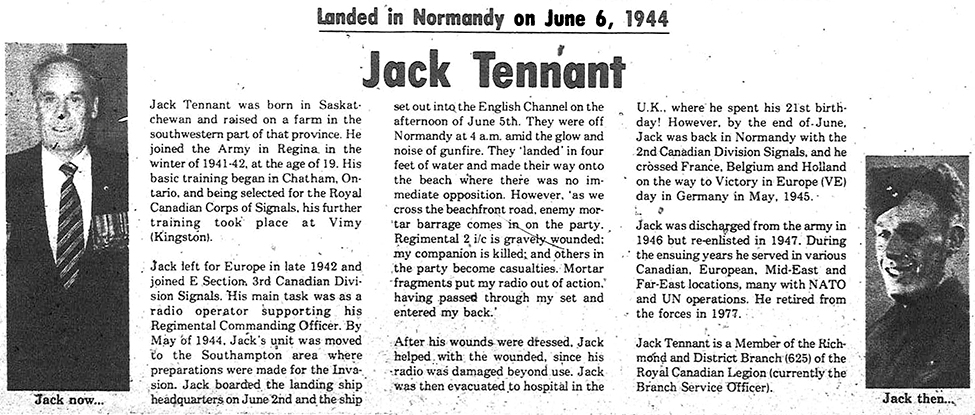Jack Tennant was born and raised on a farm in Saskatchewan. He retired in 1977 living in Richmond, Ontario and was a member of the Richmond & District Branch (625) of the Royal Canadian Legion.
