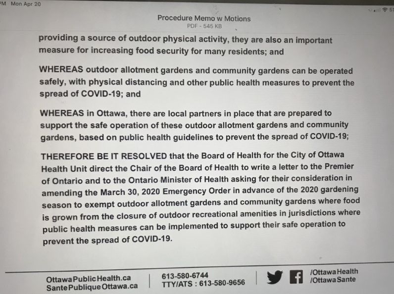 (Board of Health procedure motion put forward by Councillor Keith Egli requesting that community gardens be allowed to proceed for the season. From Councillor Kavanagh’s twitter feed.)