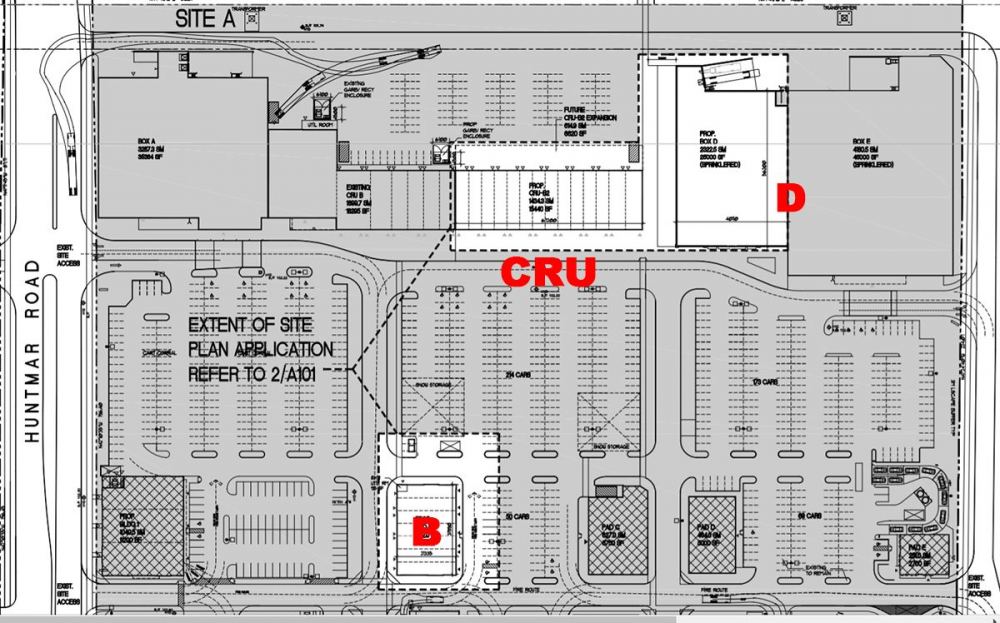 • CRU “B-2”, highlighted in the upper-left of the map, altered from the previously approved master plan, would be a multi-tenant building  that connects to the existing commercial strip mall.