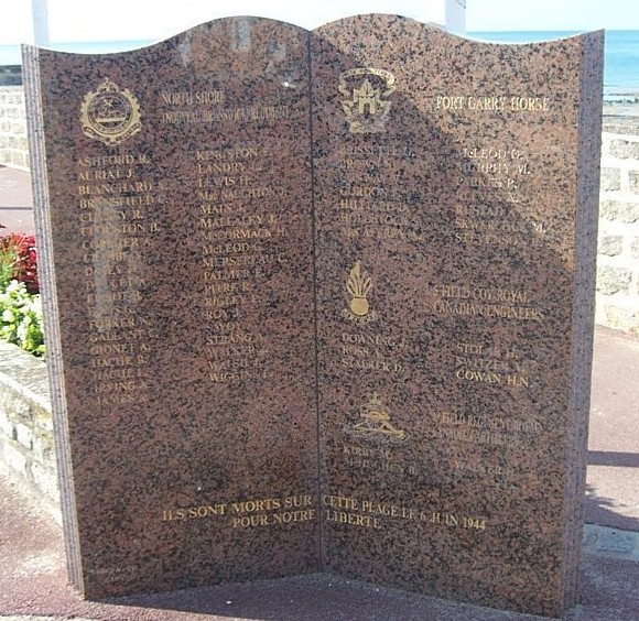 There is another memorial located in St-Aubin-ser-mer, France that is dedicated to the memory of the North Shore Regiment, the Fort Garry Horse, Royal Canadian Engineers and the Royal Canadian Artillery. This memorial is dedicated to those Canadian who lost their lives while invading Juno Beach on June 6, 1944. The photo is below and compliments of John S. Brehaut.
