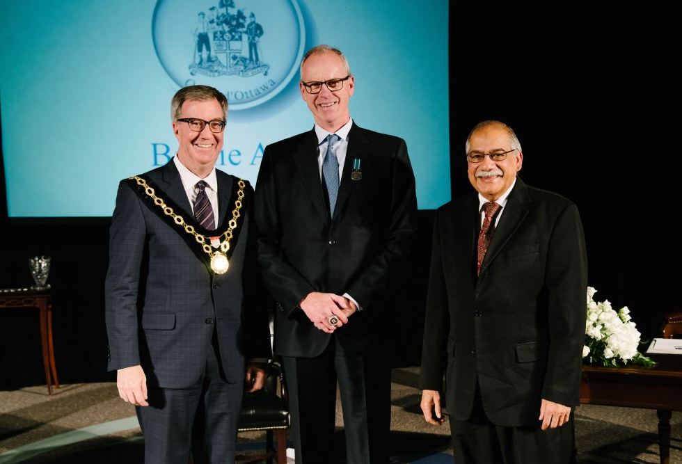 Photo: Mayor Jim Watson and Stittsville Coun. Shad Qadri induct Bernie Ashe into the Order of Ottawa at a ceremony on Nov. 22.