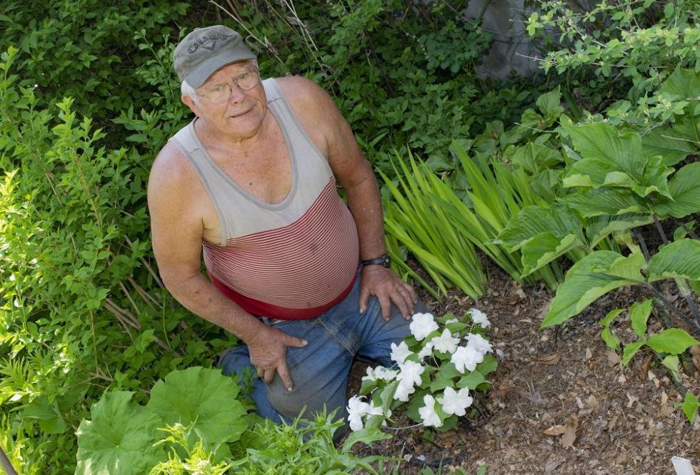 Photo: Brian Carson with a cluster of rare double trilliums at his home in Stittsville. Photo by Devyn Barrie.