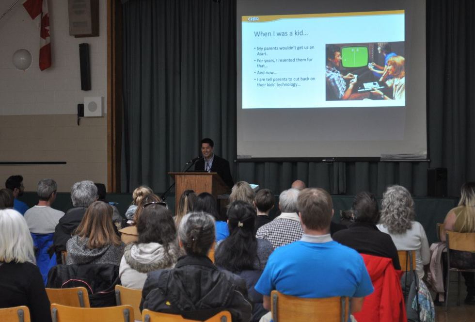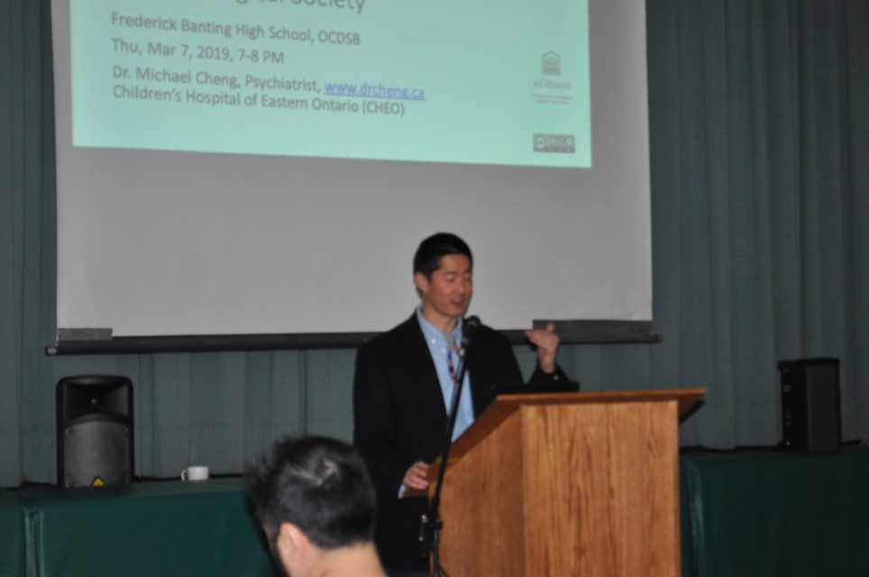 The parents and guardians of the students were invited to an evening presentation on ‘Technology and Adolescent Mental Health’ given by keynote speaker, Dr. Michael Cheng, Child and Family Psychiatrist from CHEO. Dr. Cheng is a light-hearted speaker at events such as this, but his message is serious. He is passionate about youth and their mental health, especially with their use of technology and cell phones. Dr. Cheng is a co-founder of the eMentalHealth.ca website.