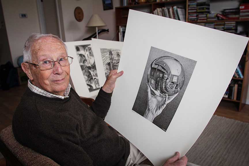 (Above: George Escher, son of artist M.C. Escher, holding a print of one of his father’s drawings, Hand with Reflecting Sphere, from January 1935. The drawing shows the room that George grew…