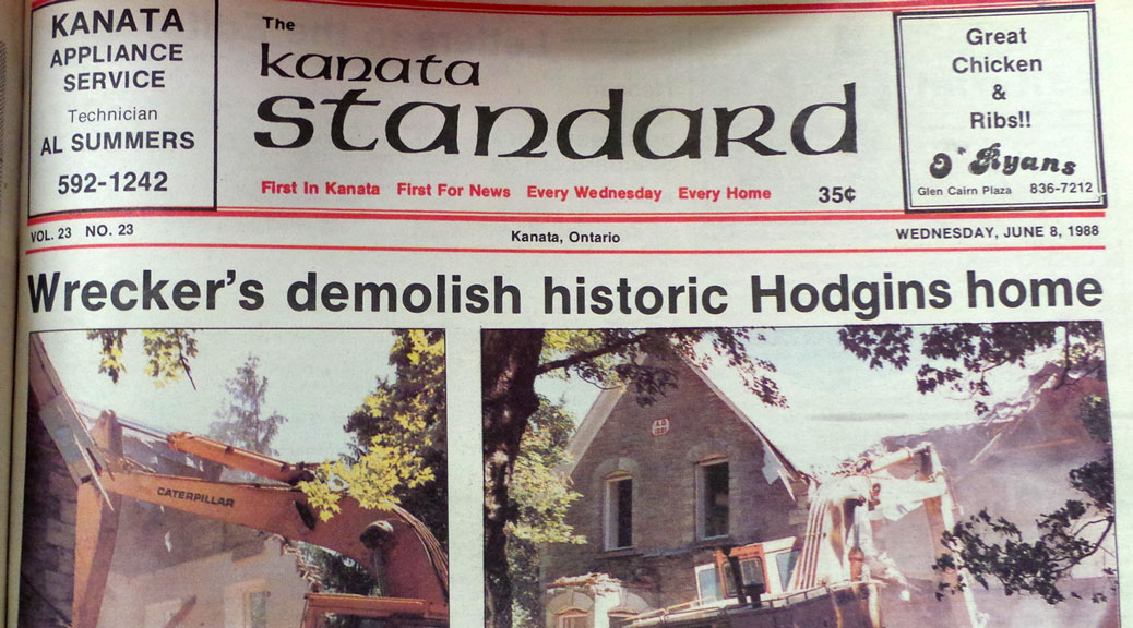“IN LESS THAN 24 HOURS IT WAS GONE,” wrote reporter Debbie Lawes in the Kanata Standard on Wednesday, June 8, 1988, a week after a wrecking crew tore down Hodgins House…