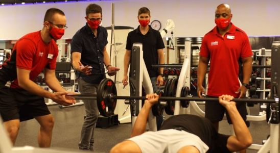 (Dr. Christopher Hicks and Dr. Andrew Petrosoniak, Emergency Physicians at St. Michael’s Hospital in Toronto, monitor a potential gym scenario of weight lifting with a client at GoodLife Fitness. Photo:…