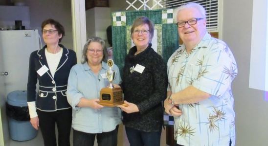 (Presentation of the Goulbourn Stittsville Horticultural Society photo contest trophy to Kathy Lunau. L to R: Penny Horeczy, Vice-President; Judith Cox, President; Kathy Lunau, Best in Show winner; John Brummell,…