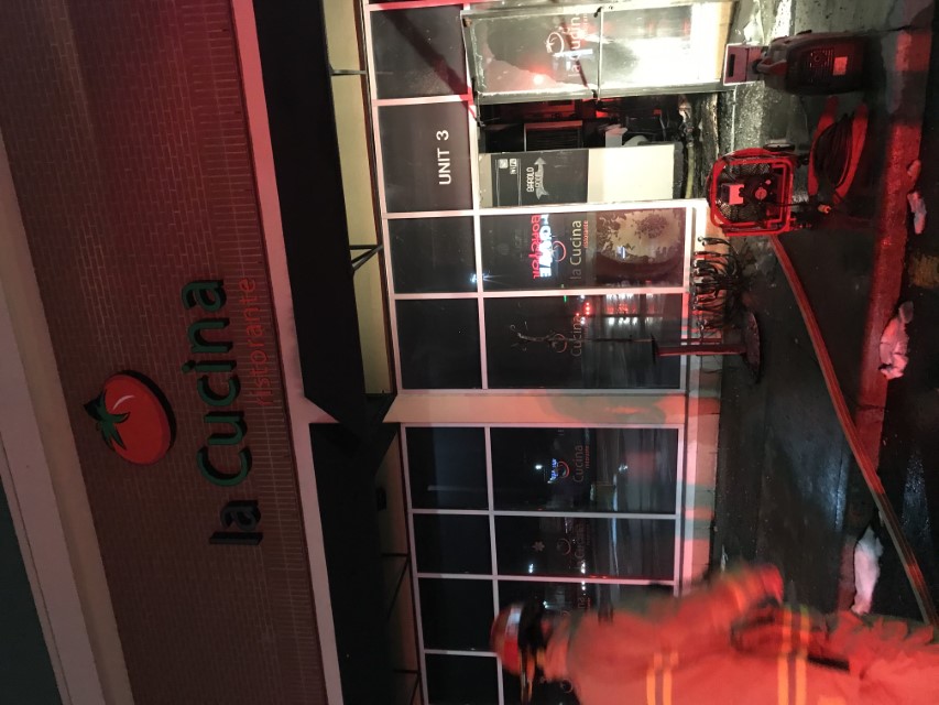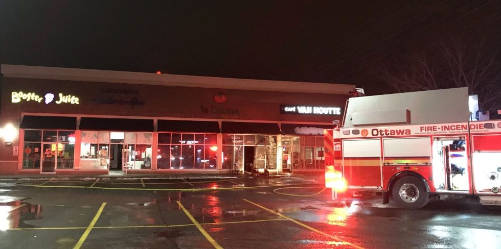 Ottawa Fire Services received a 911 call at 2:01 a.m. reporting smoke visible at a commercial building at the ‘La Cucina’ Restaurant on Hazeldean Road between Kincardine Drive and Roger Griffiths Avenue. On arrival, fire fighters confirmed flames visible at the front of the building in the one-storey commercial building and declared a working fire.