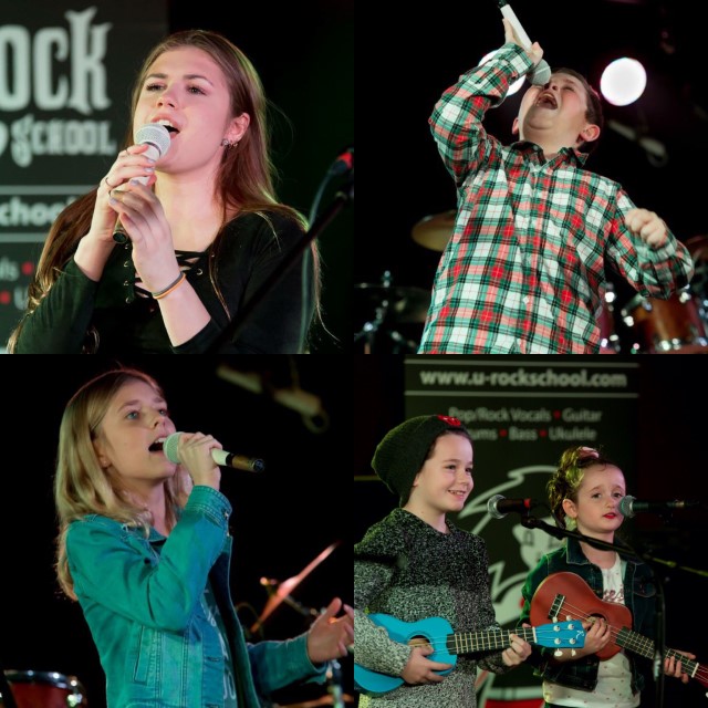 Performing at U-Rock Music School’s Winter concert at The Brass Monkey are: (Clockwise from top left) Vanessa Robinson 16; Jack Bayley 12; Lincoln Kemp 8 and Sofia Blommesteyn 5 on ukulele; and Avery Rumsey 11. Photo: Cathy Hallessey)