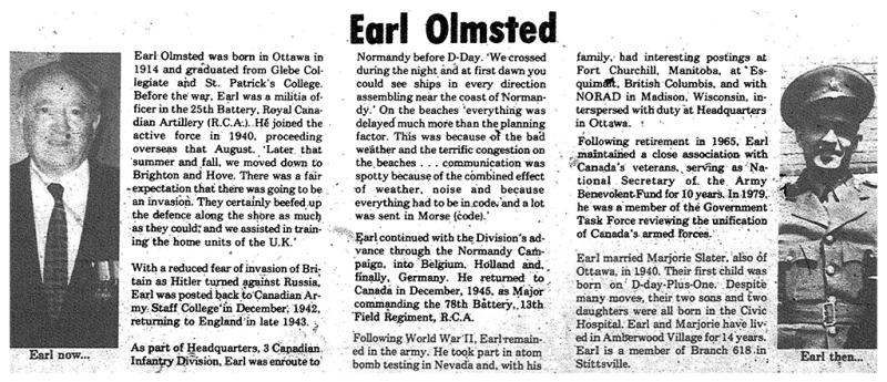 Earl Olmsted was 25 years old and one of the many Canadians who volunteered at the outbreak of World War II in 1939 to serve King and Country. Olmsted, an accounting clerk and reservist from Ottawa – a former resident of the Amberwood neighbourhood in Stittsville – was quickly commissioned as a Second Lieutenant in the artillery and sent to aid in the defence of Britain.
