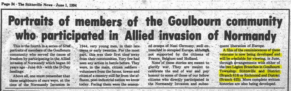 While doing his research, Osborne was shocked to find out just how much information he was able to obtain through military record research requests, unit diaries, letters home, interviews, and personal artifacts. By complete chance, he came upon a 1994 newspaper clipping from the Stittsville News. Lesley McKay was able to find the document in the Stittsville Library microfilms and located dozens of D-Day accounts from local residents, including one on Geoff’s grandfather. Lesley was able to find those profiled in the series of articles who were: Jack Tennant, Lester Mitchell, Sheldon Spearman, Richard Jamieson, Des Coughtrey, Robert Loverock, Earl Geddes, George Murphy, Roy Schmelzer, Benny Ryan, Frank Glennon, William Howe, Earl Olmsted, Leonard Saull, Ted Earle.