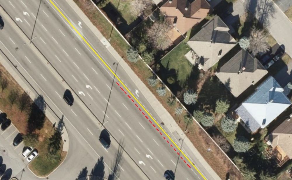 I took a screenshot of a city aerial photograph of Terry Fox Drive and added a yellow line to mark where the bike lane is, plus a broken red line to mark where the design intentionally allows for vehicles to cross the bike lane. Of course, you can bet some drivers will be crossing over the solid line anyway.