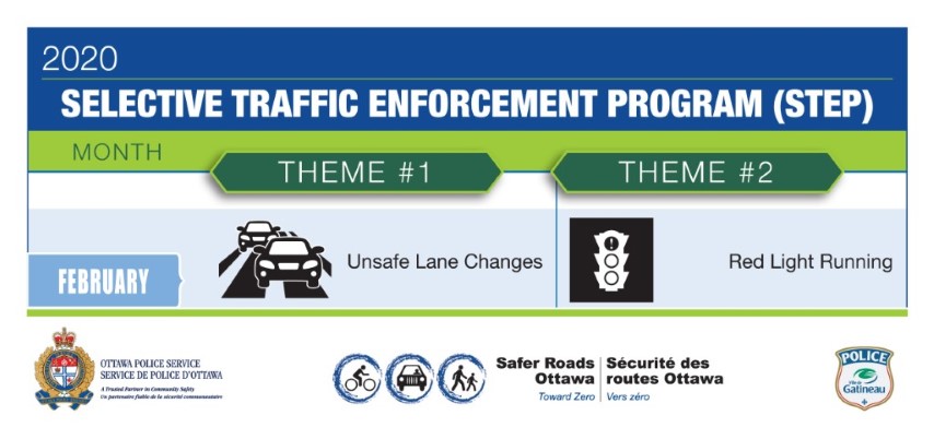 The February focus by the Ottawa Police Service’s Selective Traffic Enforcement Program (STEP), in collaboration with the Gatineau Police Service, will be unsafe lane changes and red light running during the month.
